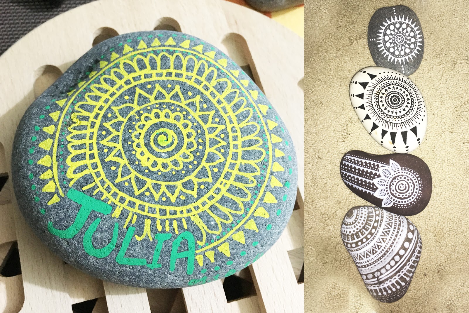 Doodles on all sorts of paper type (books, papers, newspapers, etc) leaded to searching on the Internet for all sorts of different ways of making the mandalas more special and unique. I discovered pebble art on Pinterest and Instagram. That was really intriguing because of the patience and details you have to put on a not-so-easy material. I liked it for the difficulty and for how unique the result actually came out to be.